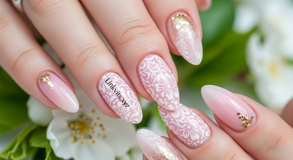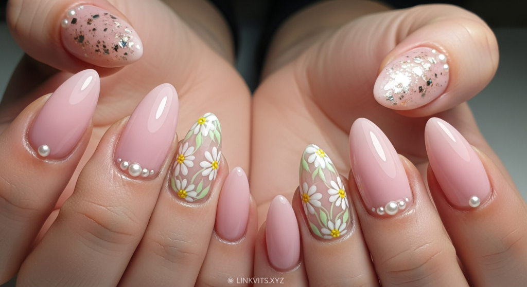 Apply a pearl powder over a soft pink or white base. This creates a “Glazed Donut” effect that reflects the light beautifully. It mimics the inside of a seashell. This is one of those classy spring nail ideas that looks expensive without being flashy.